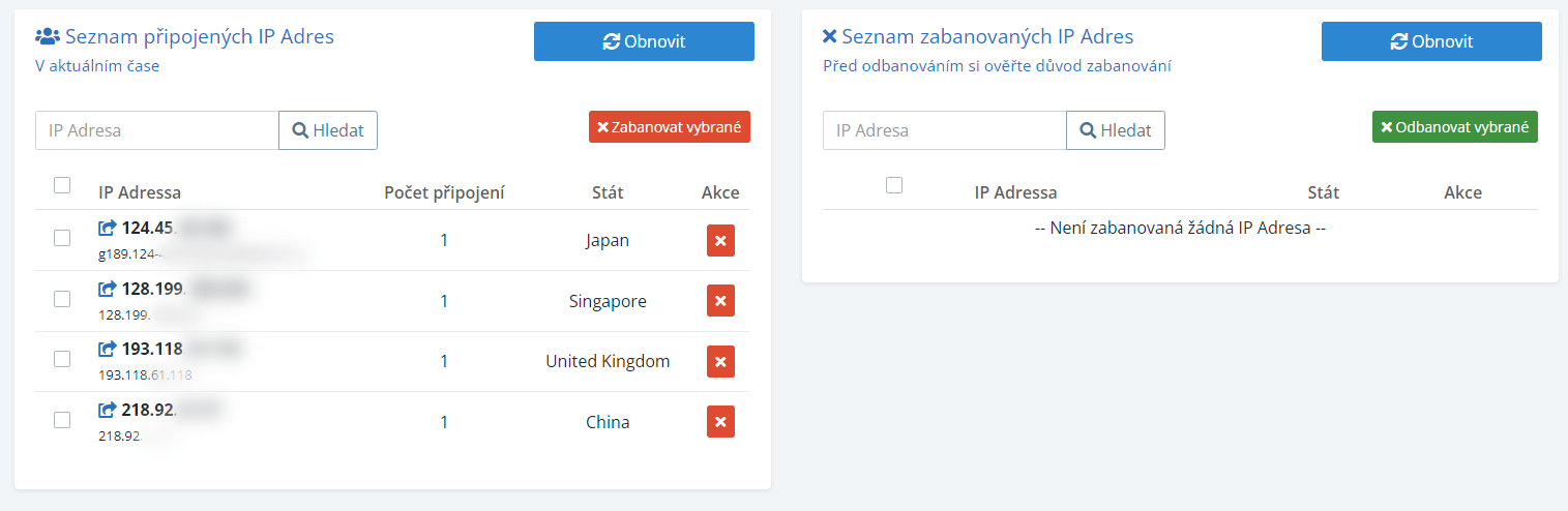 Nyní můžete blokovat IP Adresu kliknutím na červené X ve sloupečku Akce, nebo zaškrtnout všechny, které nechcete a pak kliknout na „Zabanovat vybrané„.