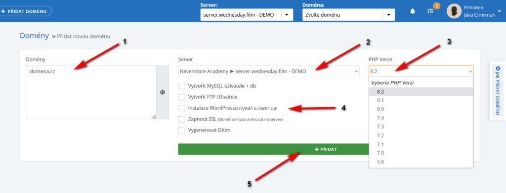 3) Vyberte PHP verzi (podporované jsou 5.6 – 8.2)