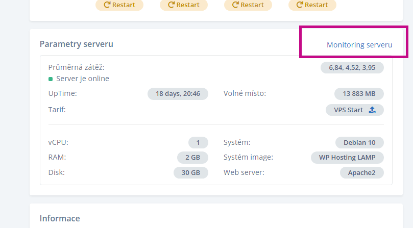Po kliknutí na možnost „Monitoring serveru“ se dostane na stránku s nastavením monitoringu
