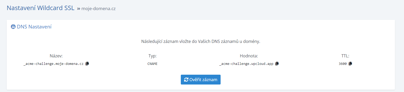 Pro správné nastavení Wildcard certifikátu budete potřebovat u domény nastavit CNAME záznam v DNS záznamech.
